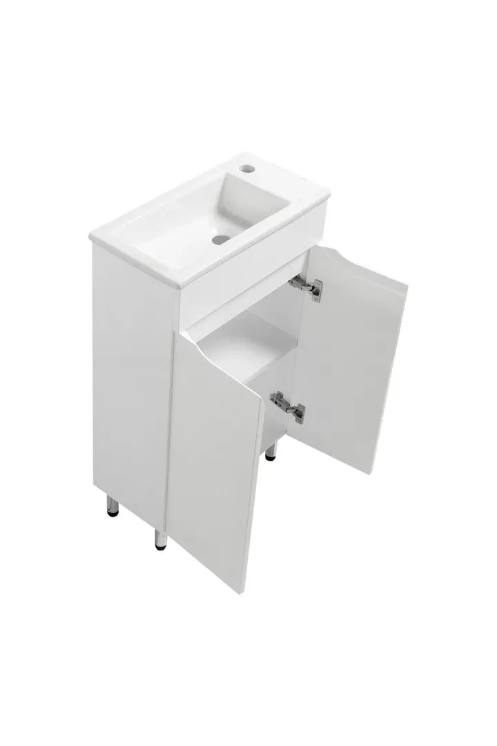 Фасад: MDF Kronospan (товщ. 16 мм) вологостійке, покрите емаллю «Kemichal (Італія)» Корпус: ДСП Kronospan (товщ. 16 мм) вологостійке, покрите емаллю «Kemichal (Італія)» Умивальник: Еос ( кераміка, Туреччина) Встановлення: напольна Фурнітура: дверцята закріплені на петлях з дотягом