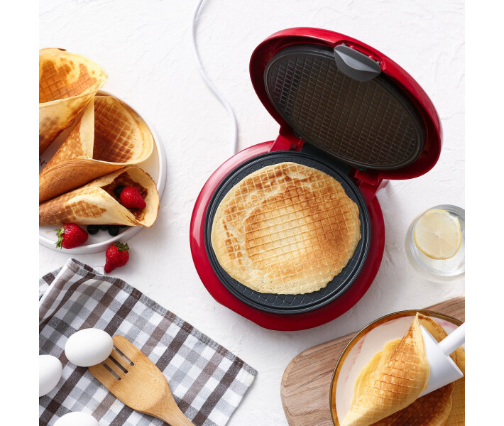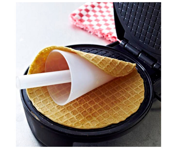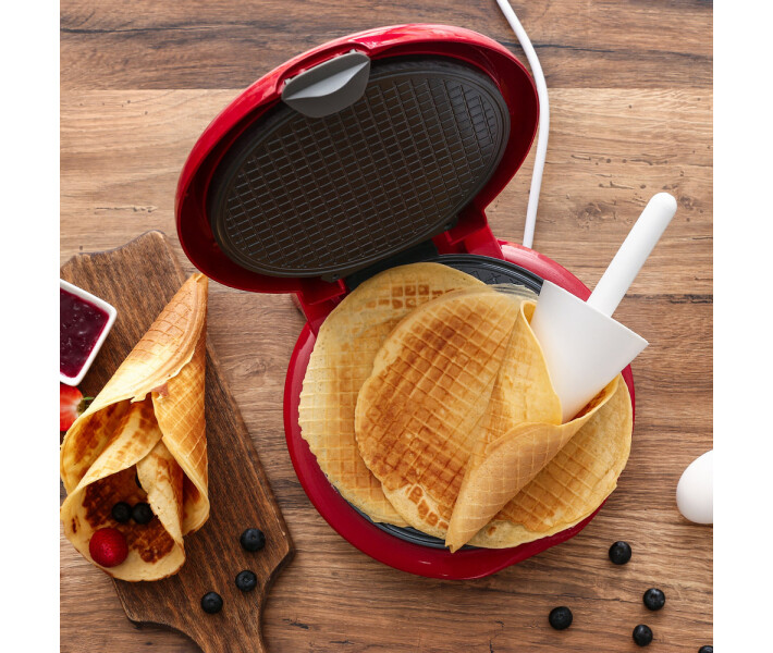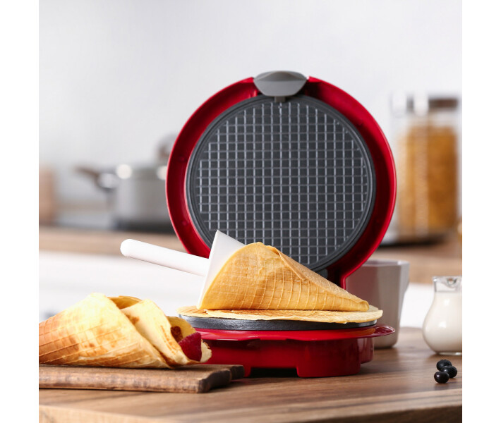 Завдяки компактним розмірам та фіксатору вафельницю зручно зберігати. На кришці є світлові індикатори живлення та готовності до роботи, що полегшує контроль процесу приготування. У комплект входить конус для приготування ріжків.