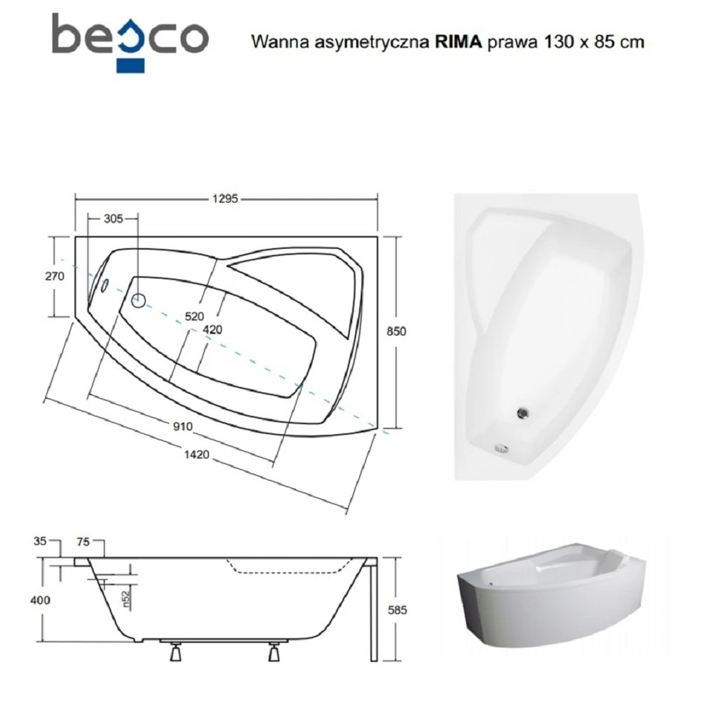Велика розмірна сітка. Ви з легкістю підберете сантехніку під необхідні розміри приміщення, адже вибір дуже великий. Вибирайте: є найменші ванни Besco Rima 130х85, найбільші – Besco Rima 170x110. Також є праве та ліве положення.