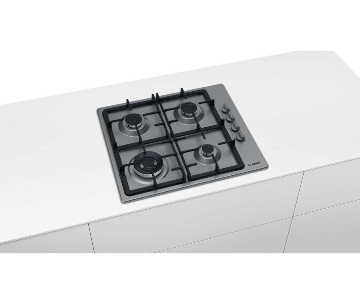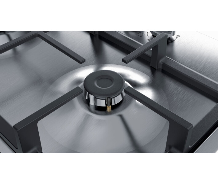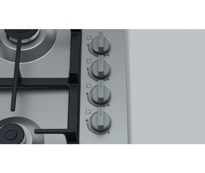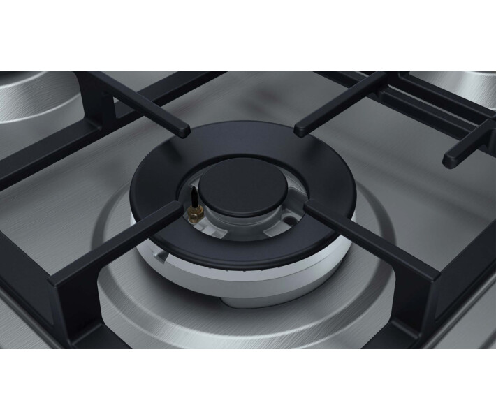 На поверхні Bosch PBH6C5B92R ви знайдете 4 газових конфорки. Передні - це потужна конфорка WOK, а також міні-пальник для невеликого посуду. Вони зазвичай вимагають максимум Вашої уваги, тому виробник розташував їх прямо перед користувачем. Позаду розташовані конфорки середнього розміру. Вони призначені для варіння або гасіння, тому таке розташування цілком правильне з точки зору зручності. Система автоматичного підпалу додає можливість роботи з поверхнею однією рукою, що на кухні надзвичайно зручно. Також у функціональності присутня система контролю витоку газу, яка перекриє газопровід на випадок непередбаченої ситуації.