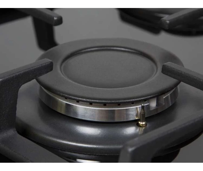 На чорному тлі високоміцного загартованого скла практично не помітні дрібні подряпини і відколи, до того ж ідеально гладка поверхня непогано піддається очищенню. Хмарно міцна решітка з чавуну виглядає солідно і масивно, що забезпечує міцність і довговічність конструкції, надійну фіксацію посуду і захист панелі від перевантаження.