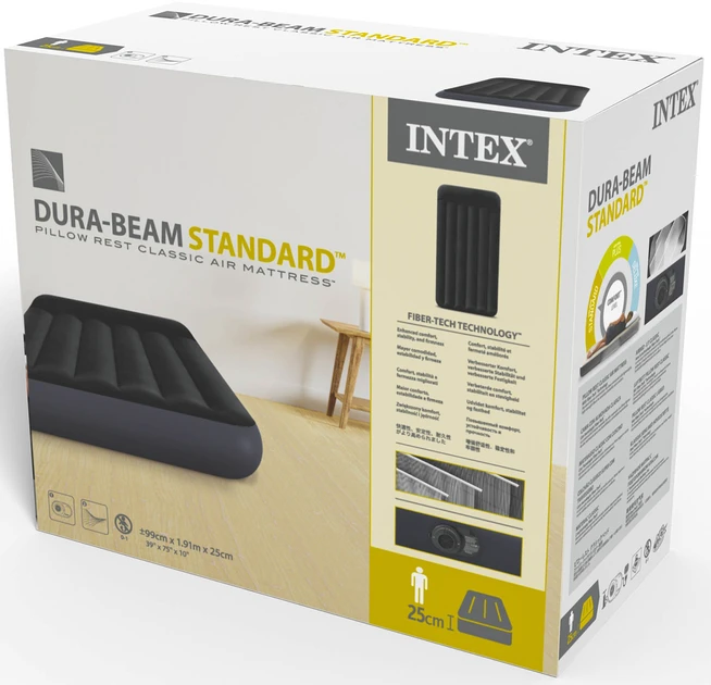 Intex 64146 серії Pillow Rest Classic Bed-незамінна річ для відпочинку вдома або на природі. Ідеально застосовувати для облаштування додаткового ліжка з нагоди приїзду гостей. Накачування матраца повітрям дає можливість індивідуально відрегулювати м'якість, покриття поверхні красивим, приємним при торканні велюровим матеріалом перешкоджає ковзанню простирадлом. Виконане в спокійному темно-сірому кольорі, виріб естетично впишеться в інтер'єр кімнати.