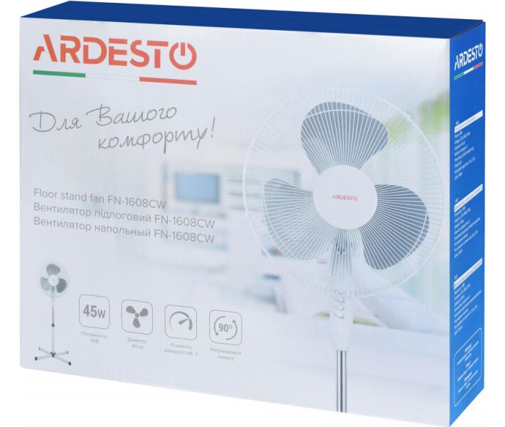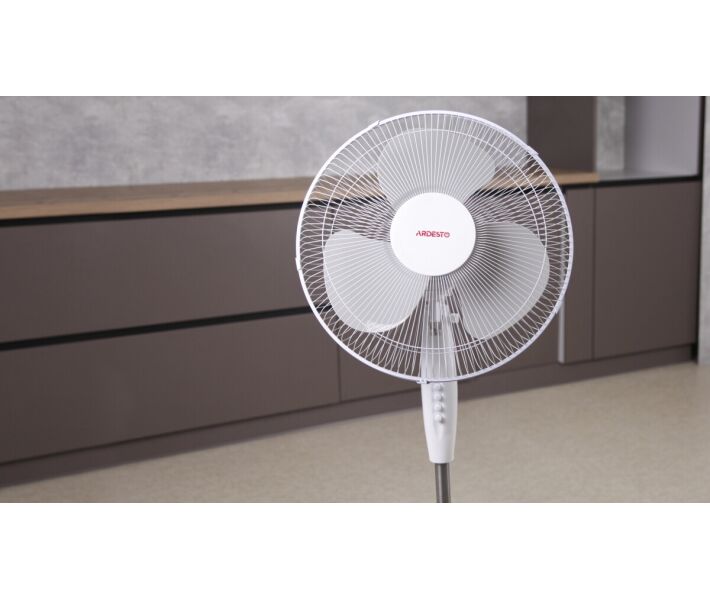 Підлоговий вентилятор Ardesto FN-1608CW буде ідеальним рішенням для офісу. Стильний, класичний, простий в роботі вентилятор обладнаний трьома об'ємними лопатями з вигнутою формою. Модель розмістилася на регульованій ніжці, виконаної з комбінації металу і пластика. За рахунок неї ви зможете відрегулювати пристрій по висоті від 1,1 до 1,25 метрів. Навколо лопатей розмістилася посилена сітка з емалевим покриттям, як і належить за правилами безпеки.