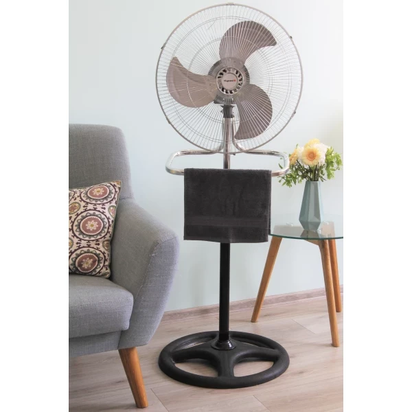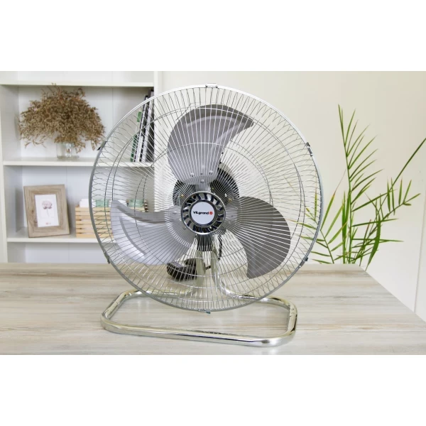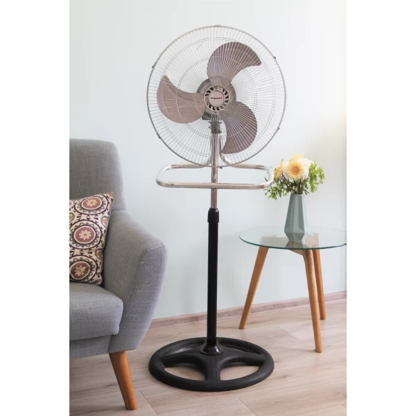 Прилад підійде для стандартних приміщень. Він врятує від спеки на дачі, в квартирі та в офісі. Корпус обертається та нахиляється, завдяки чому він охоплює великий об'єм повітря навколо себе. Вентилятор працює від мережі, його потужність 100Вт. Для зручності використання прилад має 3 режими роботи.