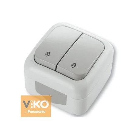 Вимикач двоклавішний зовнішній прохідний. Має пиловологозахист IP54. Номінальний струм: 10А. Напруга: 230В. Країна виробник: Туреччина.