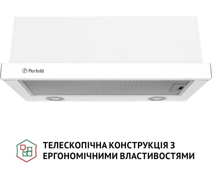 Телескопічна кухонна витяжка Perfelli TL 6212 має ергономічні властивості, тому дозволяє раціонально використовувати простір в зоні над варильною поверхнею. Конфігурація моделі включає: двигун потужністю 65 Вт; вугільний фільтр, який відповідає за очищення повітря (його можна придбати окремо); алюмінієві фільтри – затримують кіптяву та випаровування; надійне механічне керування; сучасне LED-освітлення.