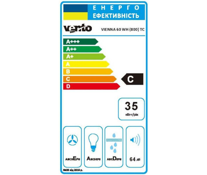 Ventolux VIENNA 60 WH (800) TC має один двигун, який має споживану потужність 130 Вт. Пристрій працює на низьких рівнях шуму, показники шуму становлять 58 дБ. Вона має три доступні швидкості роботи, інтенсивність та інші показники можна вибрати на сенсорній панелі управління на передньому боці витяжки. Витяжка висвітлюється по периметру двома LED лампами потужністю 1.5 Вт кожна.