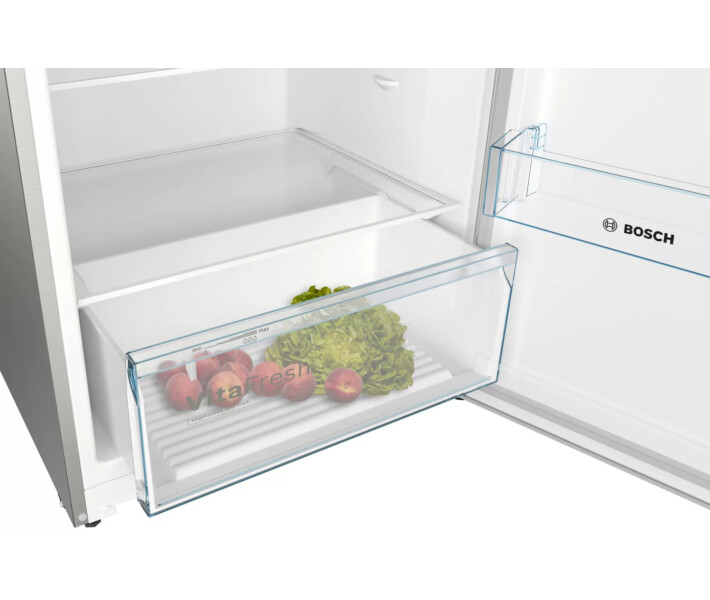 Холодильник Bosch KDN55NL20U має висоту 186 сантиметрів. При цьому ширина фасаду збільшена до 70 сантиметрів. Таке незначне збільшення дозволило отримати всередині значно більше місця для зберігання! Варто відзначити, що за рахунок більшого розміру поличок Ви отримуєте можливість зберігати навіть великогабаритні продукти і посуд нестандартного розміру.