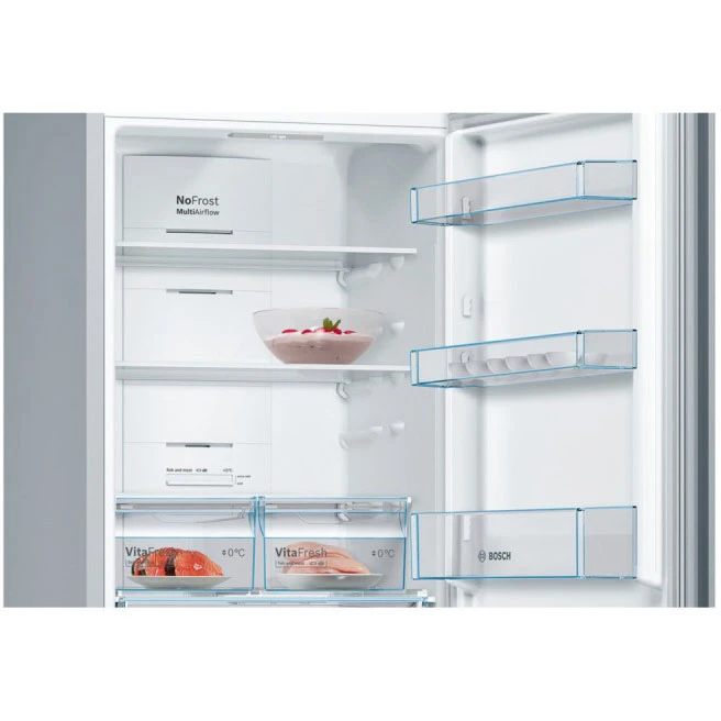 Холодильник Bosch KGN36VL326 Холодильник Bosch KGN36VL326 — це двокамерний пристрій із нижньою морозильною камерою, оснащений передовими технологіями для оптимального зберігання продуктів. Він має систему No Frost, яка виключає необхідність розморожування і підтримує ідеальну температуру для тривалого зберігання. Основні характеристики: Загальний обєм: 324 літри 237 л — холодильна камера, 87 л — морозильна Клас енергоспоживання: A++ Рівень шуму: 39 дБ Габарити ВхШхГ: 186 х 60 х 66 см Потужність заморожування: 14 кг/доба Енергоспоживання: 260 кВт⋅год/рік Особливості: VitaFresh: Спеціальна зона свіжості для м’яса та риби з низькою температурою, а також відділення для фруктів та овочів з регульованою вологістю. SuperCooling і SuperFreezing: Ці функції допомагають швидко охолодити або заморозити нові продукти, запобігаючи підвищенню температури всередині камер. MultiAirflow: Система циркуляції повітря рівномірно розподіляє холод, мінімізуючи температурні коливання. Антибактеріальний захист і LEDосвітлення забезпечують комфортне та безпечне використання. Холодильник Bosch KGN36VL326 відрізняється сучасним дизайном і продуманою функціональністю, ідеально підходить для сімейного використання