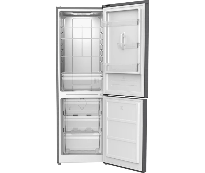 Ця модель має стильний інтер'єр із темною нержавіючою сталлю на зовнішній панелі та LED освітленням усередині. У холодильній камері встановлені чотири скляні полиці, три дверні кошики та контейнер для овочів, що дає великий простір для зберігання продуктів.