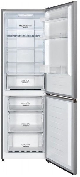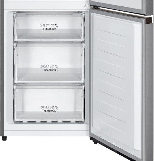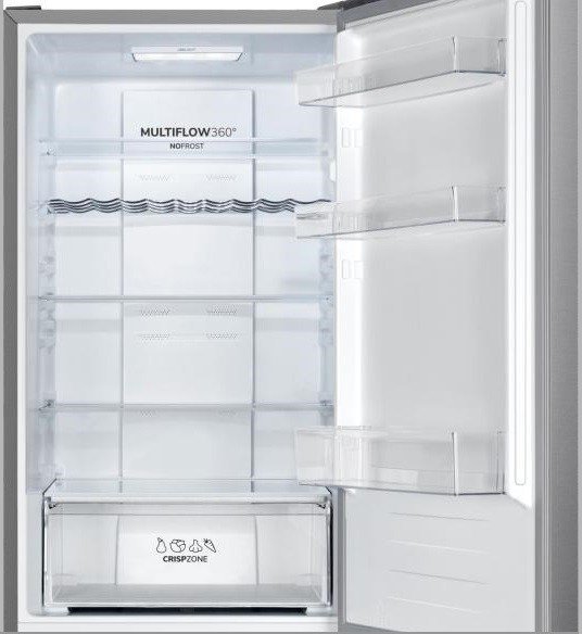 Gorenje NRK619FAS4 — двокамерний холодильник із системою NoFrost Plus, об’ємом 300 л та економним енергоспоживанням. Оснащений великою зоною зберігання овочів CrispZone, функцією швидкого заморожування FastFreeze і рівномірним охолодженням MultiFlow 360°. Працює тихо, має LED-підсвітку та стильний сучасний дизайн.