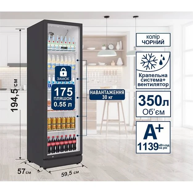 Окремостояча вітрина має загальний корисний об'єм 350 літрів і працює за класом енергоспоживання A+. Система охолодження холодильної камери є статичною.