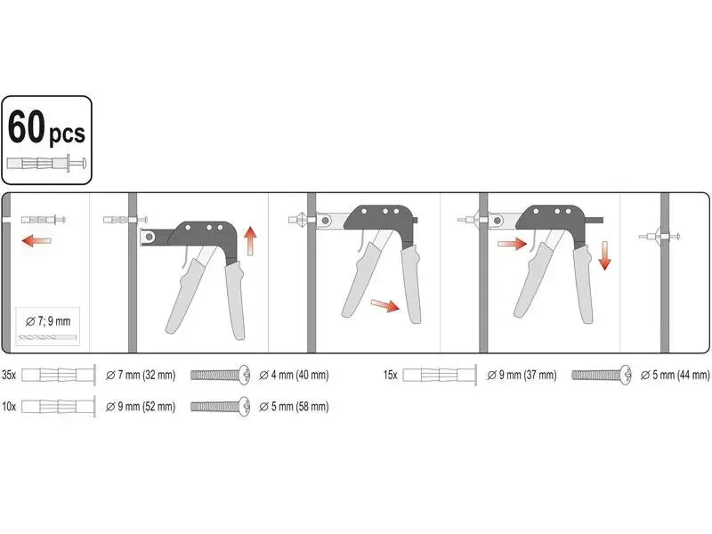 Використовується для прикріплення легких елементів до гіпсокартону, наприклад, вішалок, картин, полиць, настінних світильників. Використання обжимного інструменту виключає трудомістку роботу з викруткою, для ідеальної затяжки дюбеля потрібно кілька секунд.