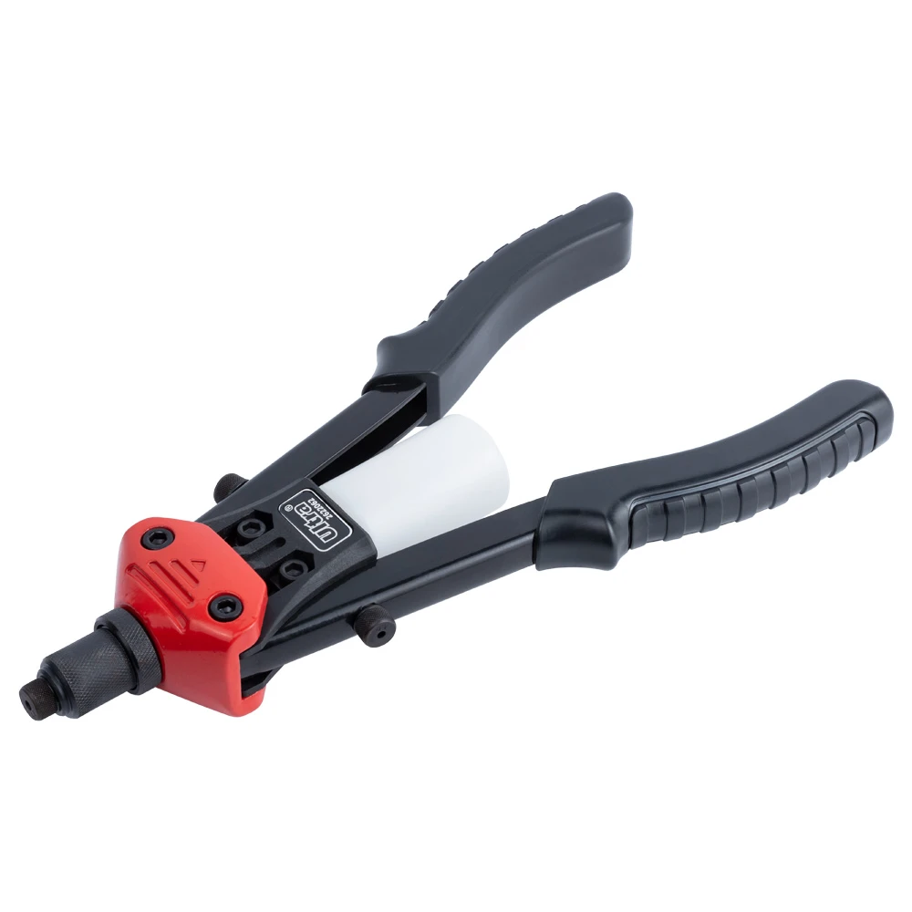 Спеціально розроблений для важких режимів роботи дворучний заклепочник. Заклепочник дозволяє швидко виконати заклепувальне з'єднання навіть при односторонньому доступі до місця клепки. Посилений ударостійкий корпус. Кулачки заклепочник виготовлені з хромомолібдена, що гарантує тривалий термін експлуатації. Трьохкулачкова конструкція забезпечує надійний рівномірний зажим заклепки. У комплект входять 5 насадок під різні діаметри заклепок.