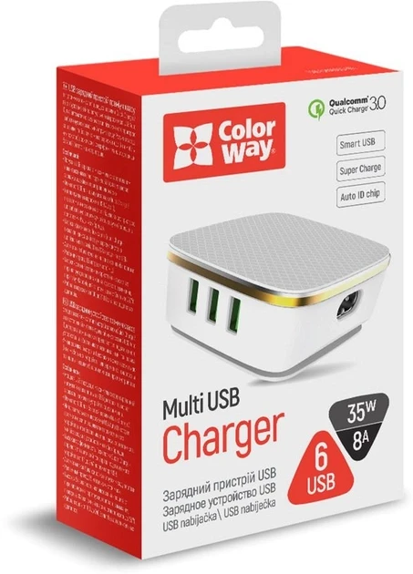 Інформація Зарядний пристрій Colorway 6 USB (1QC3.0 + 5 AUTO ID) 7A (35W) white (CW-CHS019Q-WT)