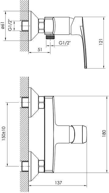 Представлену тут модель одноважільного настінного змішувача для душу Kampa 15285 від Imprese виготовлено з високоякісної латуні з покриттям блискучого кольору, обладнано нижнім відводом для під'єднання душового шланга під діаметр 1/2", встановлювати на 2 отвори за допомогою ексцентрикового з'єднання під діаметр 1/2".