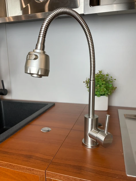 Wezer EKO4D-01 має одноважільне управління напором і температурою води. Як механізм змішування встановлено картридж 35 мм, що вирізняється безшумною роботою та надійністю. Сучасний, стриманий дизайн чудово підійде під будь-який сучасний інтер'єр. Монтаж змішувача здійснюється за допомогою кріплення типу "гайка". Гнучкий гусак є найкращим рішенням для установки на кухню, де процес приготування займає великий період часу. З його допомогою ви зможете змінювати напрямок струменя і режим, висоту і кут нахилу