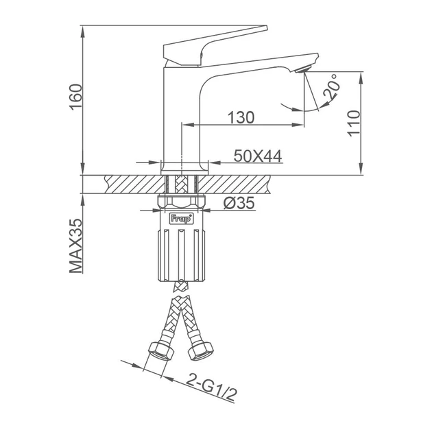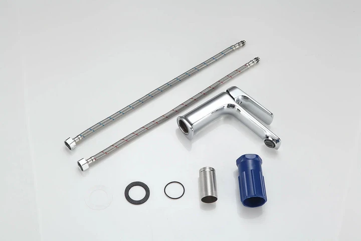 Монтаж змішувача здійснюється горизонтально, що робить його сумісним із більшістю типів умивальників. Гнучке підведення полегшує процес встановлення, а приєднувальний розмір 1/2" відповідає стандартним водопровідним системам.