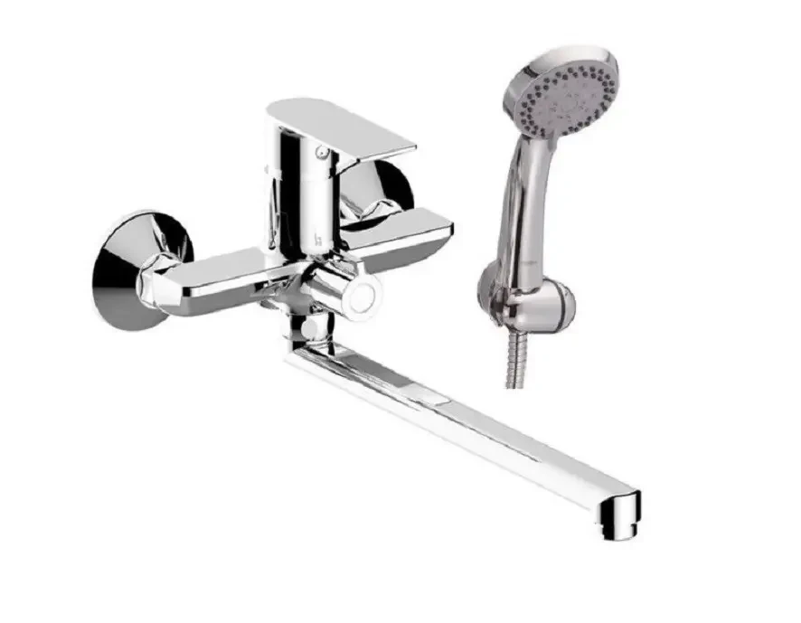 Haiba Alex 006 Euro латунний змішувач для ванни з душем, змішувач з одним важелем, з довгим виливом, з вбудованим в корпус поворотним перемиканням на душ - Euro (букса), покриття - хром, іспанський картридж (35 мм), аератор Neoperl, довгий поворотний виливши 35см., ручка змішувача лита без отвору. Змішувач для ванни Haiba Alex 006 Euro комплектується: душовим шлангом, душовою лійкою (5 режимів), тримачем лійки.