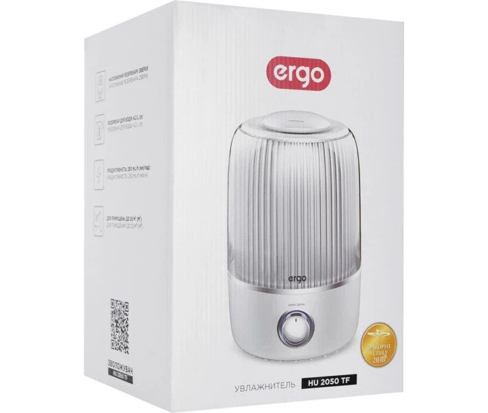 Ergo HU 2050 TF відрізняється приємним зовнішнім виглядом, який відмінно впишеться в любо інтер'єр. Крім цього невеликі розміри дозволяють розмістити зволожувач в будь-якому куточку. Також апарат оснащений зручним механічним перемикачем і ручкою, яка робить його транспортування комфортної і легкої.